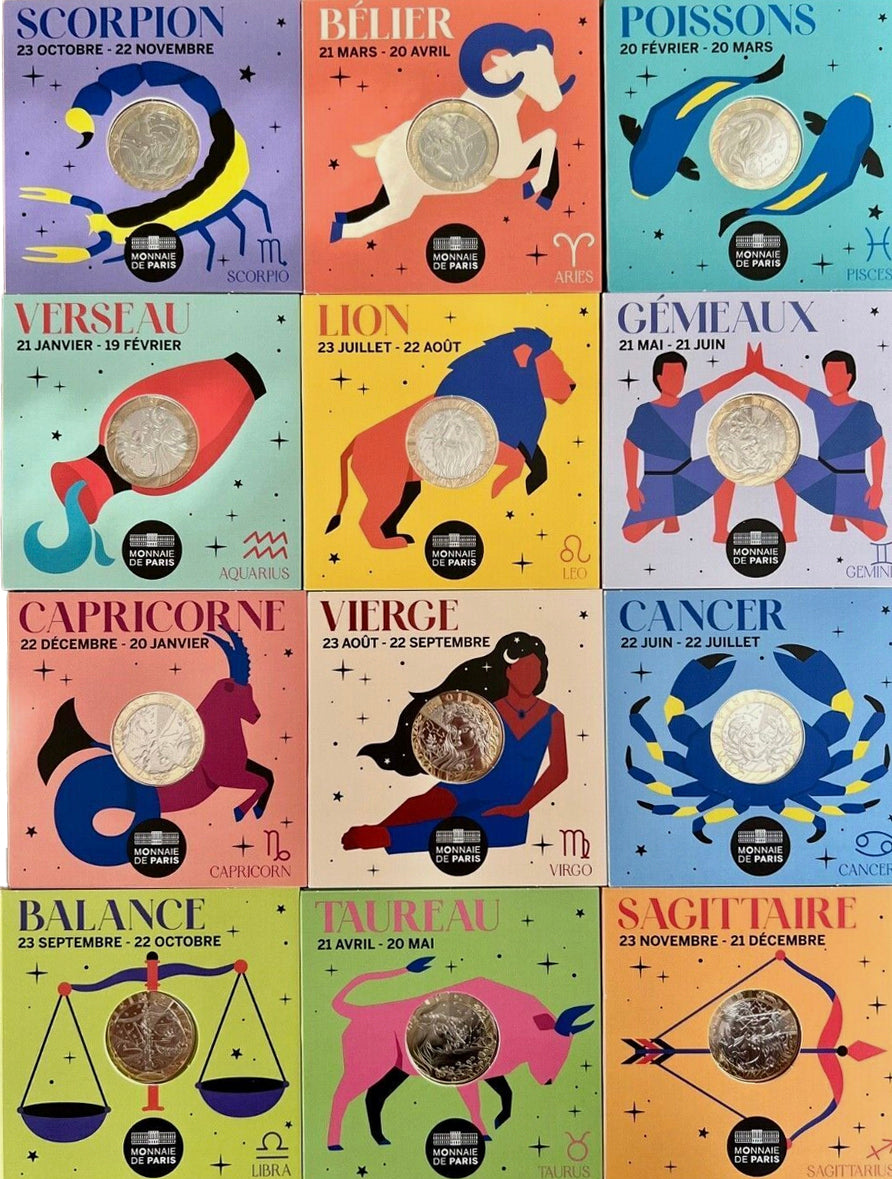 Κριός, Ταύρος, Δίδυμος, Καρκίνος, Λέων, Παρθένος, Ζυγός, Σκορπιός, Οφιούχος, Τοξότης, Αιγόκερως, Υδροχόος και Ιχθύς.